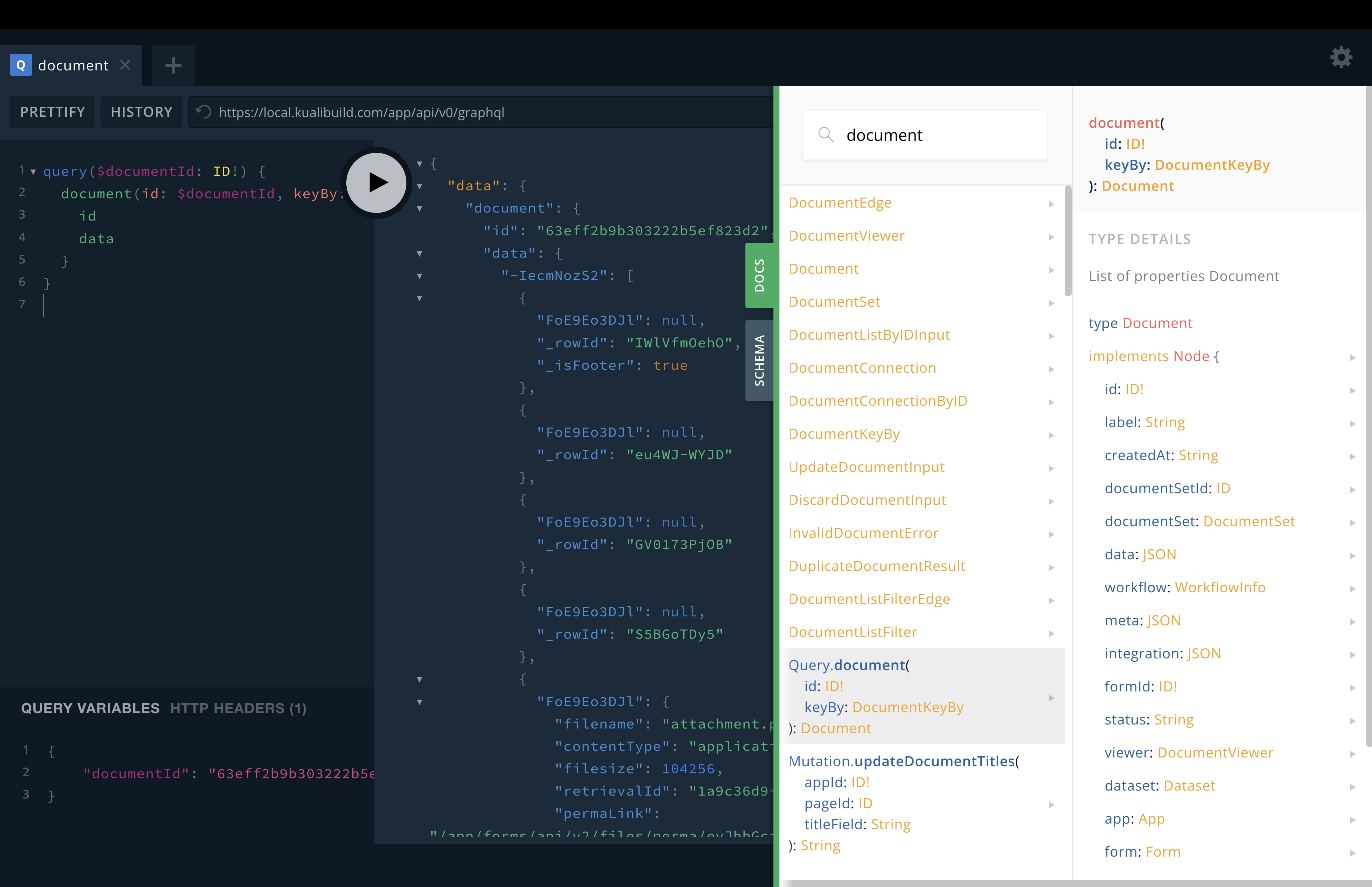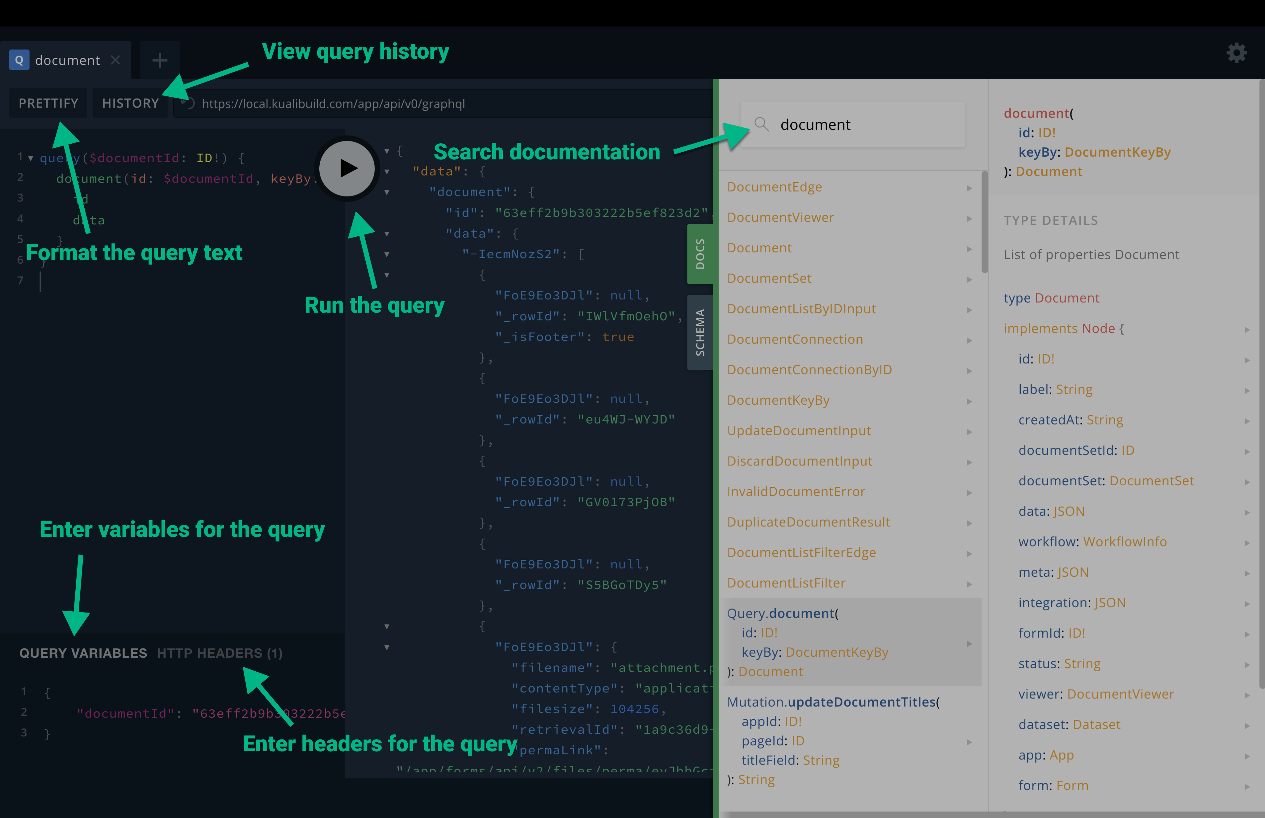 Built into GraphiQL is the detailed documentation for the GraphQL API. It is comprehensive and always up‑to‑date on every little aspect of the Kuali GraphQL API. That documentation is generated programmactically directly from the GraphQL API via requests to the GraphQL API for its schema. That's a little meta, but that's what allows it to be always up‑to‑date with every little detail.
